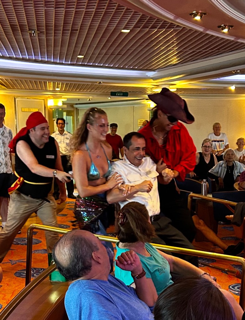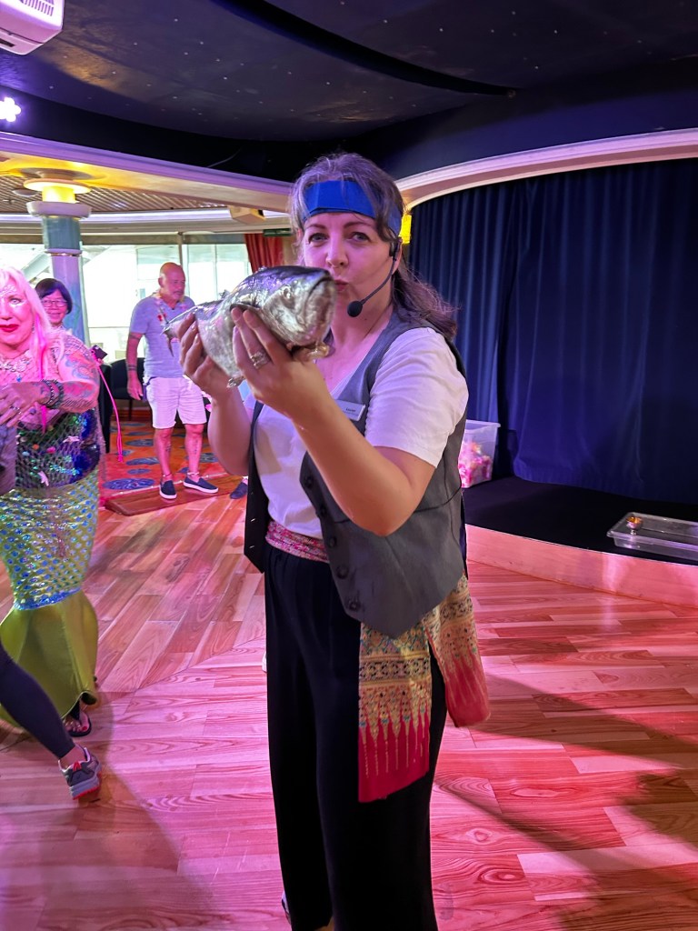 After breakfast, I go for a walk on the deck, then go for a swim. The pool water 💦 temperature is perfect! (no swimming photos yet) Now it’s time for lunch! After lunch, we have a guest speaker who is all about “tips & tricks” using our phone camera. It is great fun being a student again. We also have a craft class, I made a necklace. Then I rush off to hear the next port talk. I need a nap but it’s already dinner time. One more deck walk then off to my cabin to slip into comfy PJs. There are more speakers and after dinner music but I do like my quiet cabin time before bed. I’ll leave that night life for the youngsters on board. After all, I have to prepare for another day. “Seas the day!”