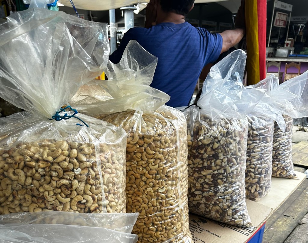 “Cajú” and Castanho-do-Brasil” em abundância! Cashews and Chestnuts/Brazil nuts galore! Jeesh! Look at that knife. (Charlie, don’t get any funny ideas. I’m not holding a Brazil nut for you to shell ~ only green beans)