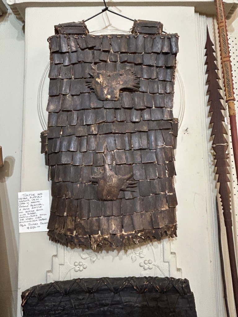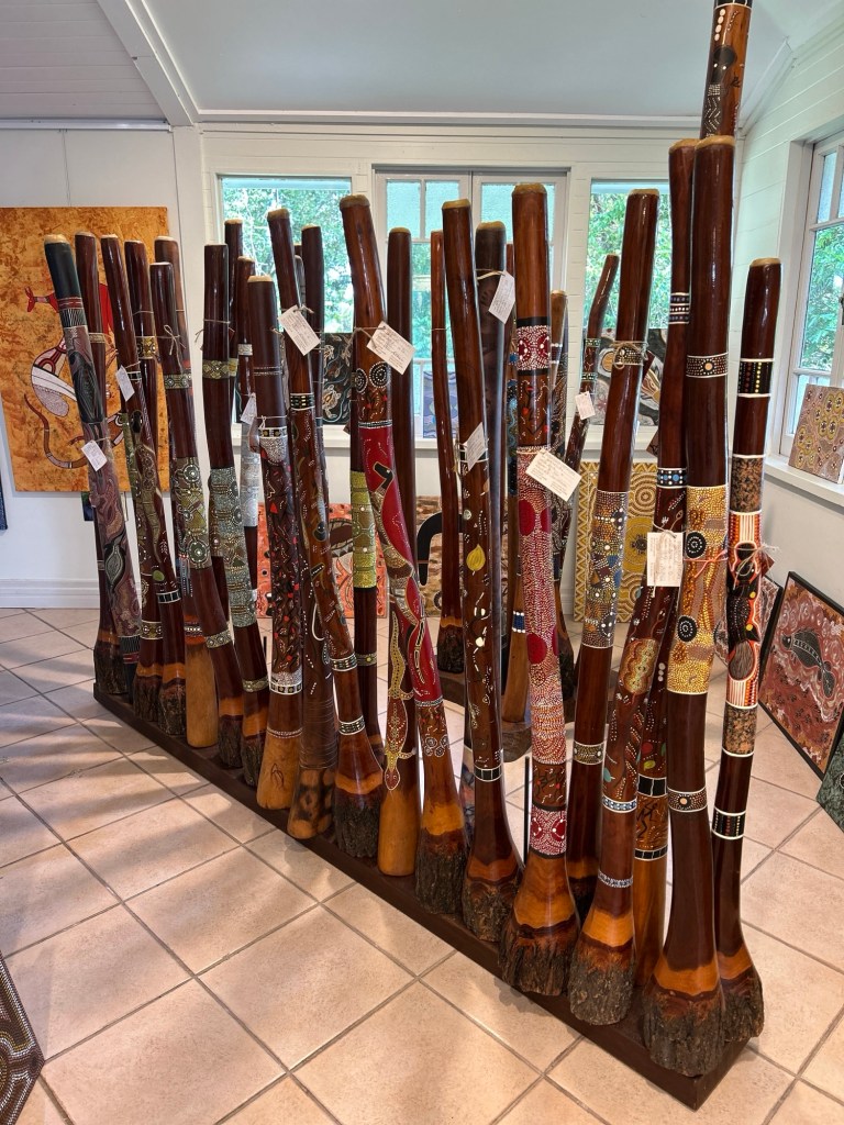 Aboriginal Didgeridoo ~ made from eucalyptus trees hollowed out by termites. The mouthpiece is made of beeswax.It is traditional that only men play the DidgeridooPythons use fern baskets as shelter ~Watch out 😬 Ceremonial vest made of turtle and water buffalo Bench crafted from railroad rails Barron River & Falls ~ very low ~ watch out for crocks 😬